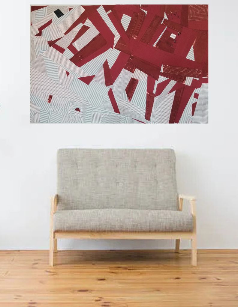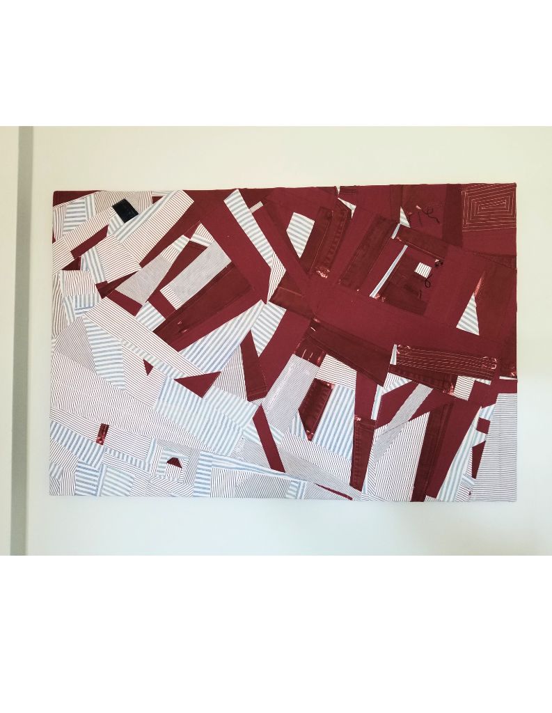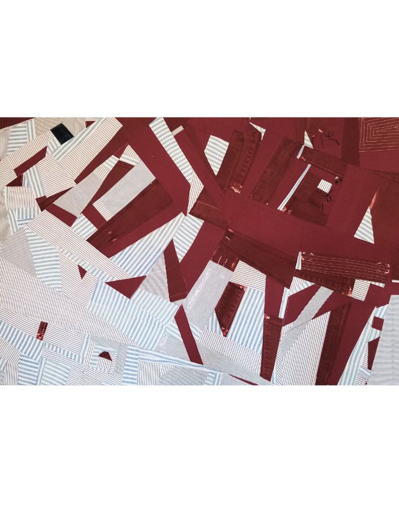 Machine pieced, machine embroidery and quilting, stretched over canvas frame, made from repurposed fabrics