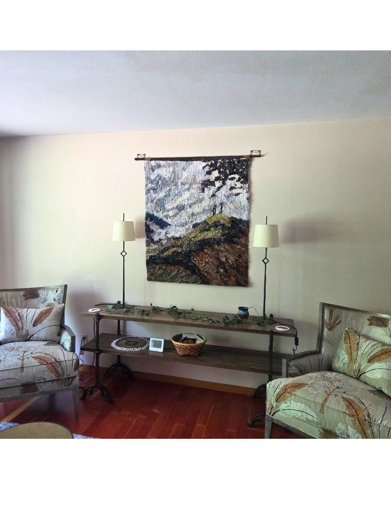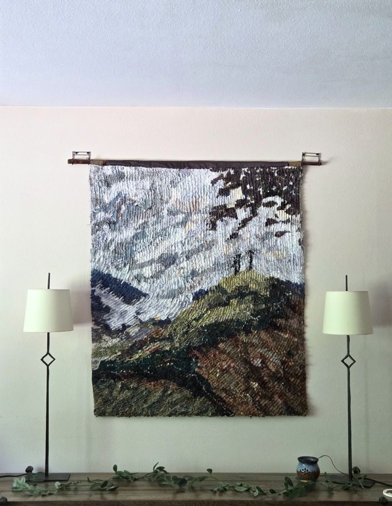 Repurposed fabrics, collaged, machine quilted, cut in chenille technique