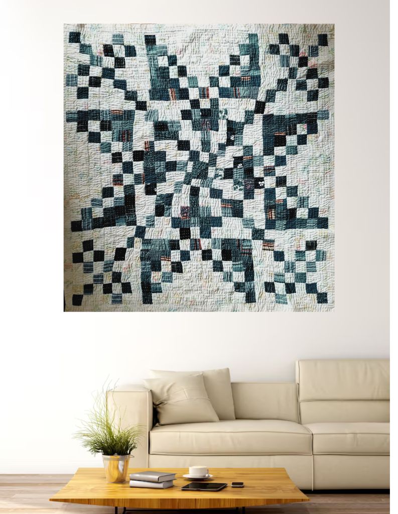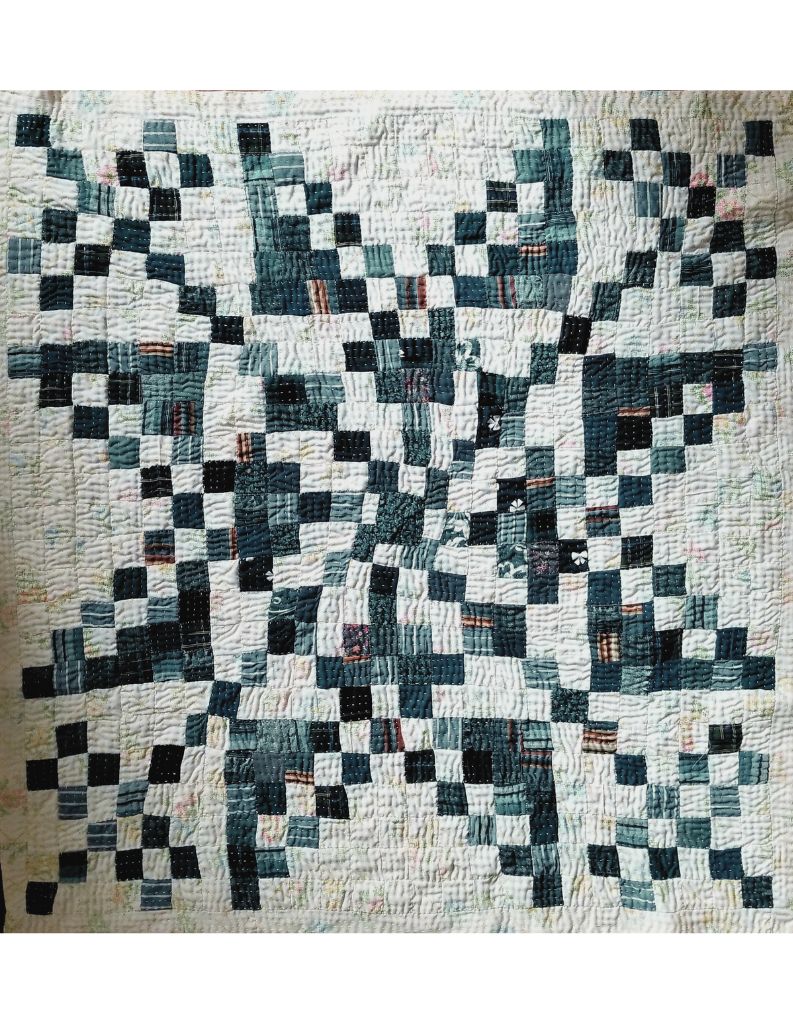 Repurposed fabrics, hand stitched/quilted in kawandi style, design based on Scandinavian knitting pattern