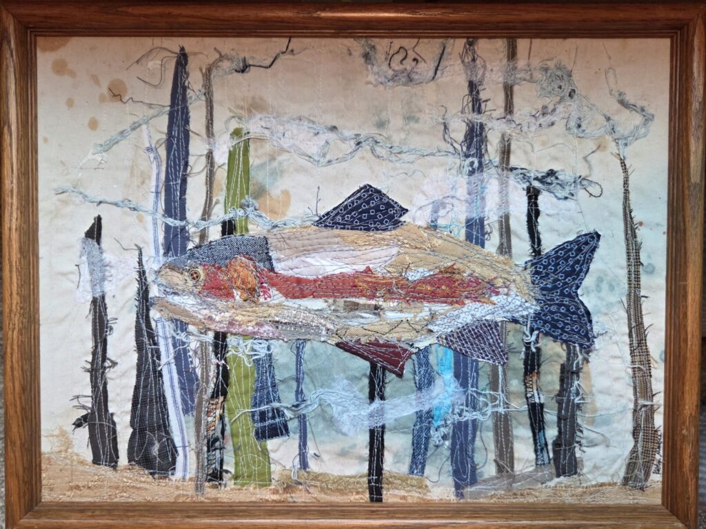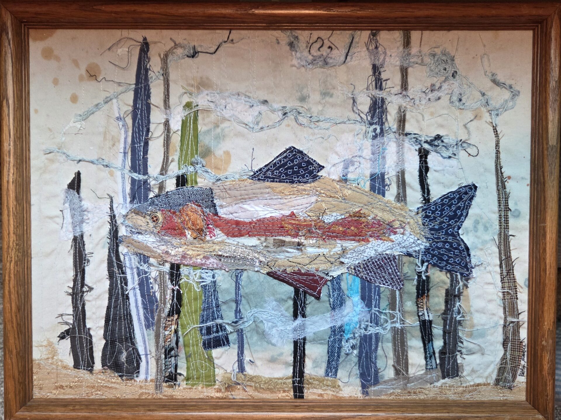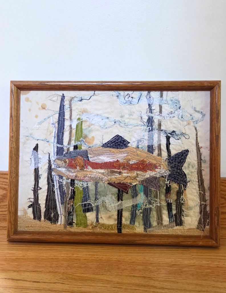 Collaged repurposed fabrics, machine stitched with thread painting