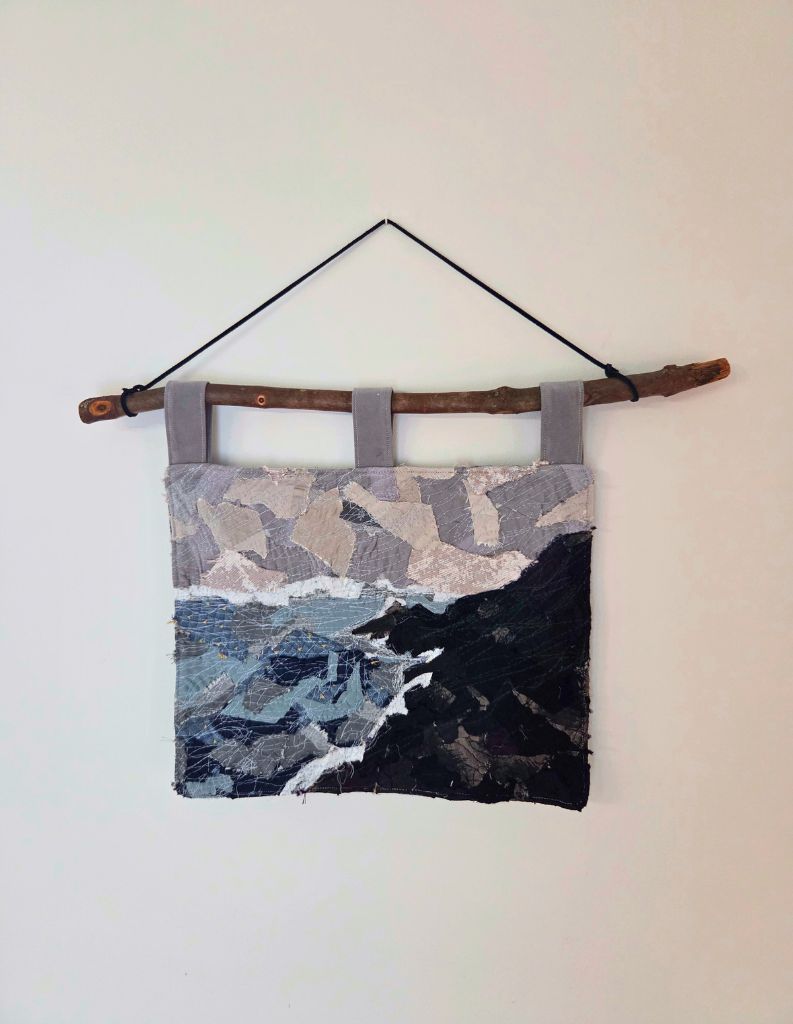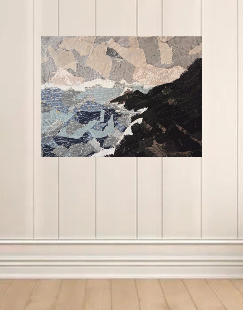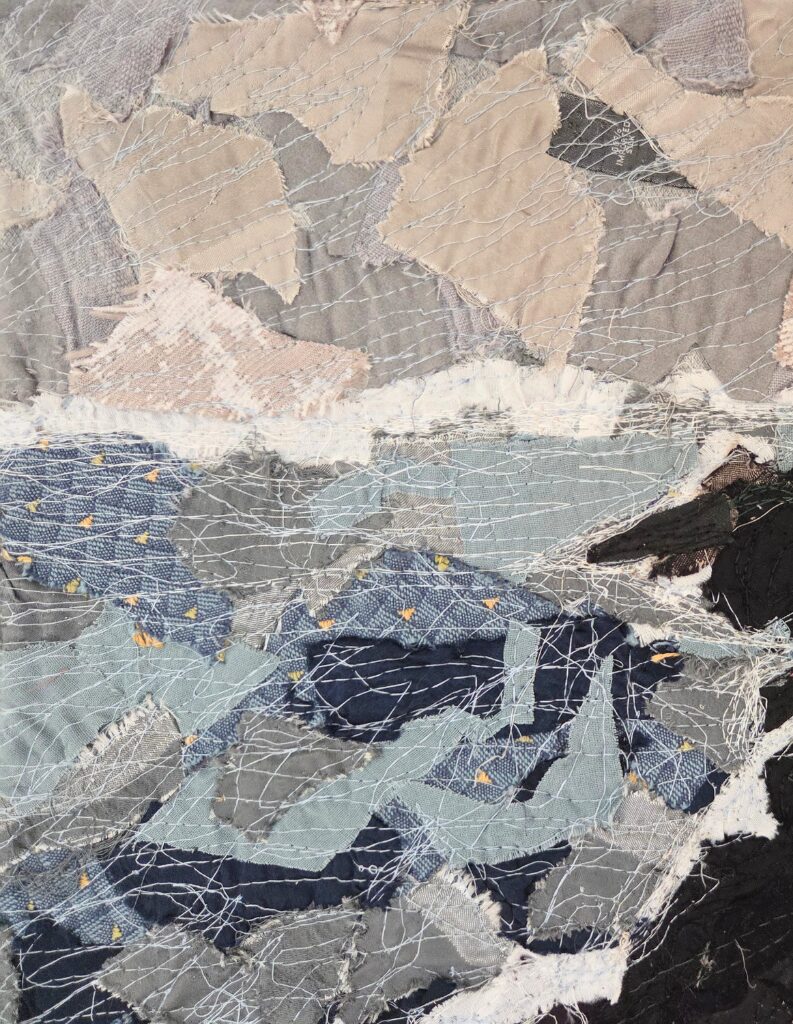 Repurposed fabrics collaged and stitched with thread